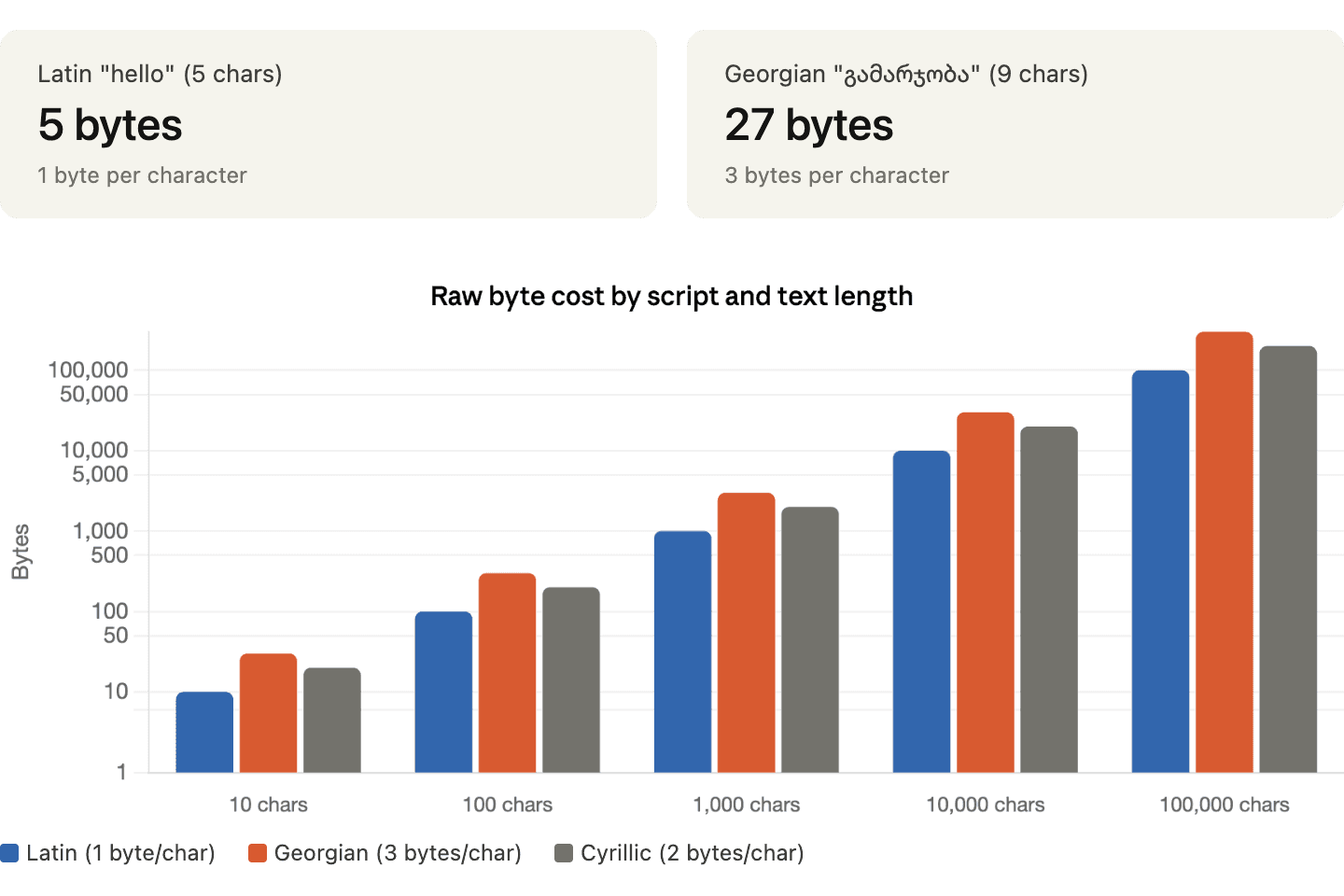 The most fundamental issue is encoding. UTF-8, the universal character encoding used across virtually all modern NLP pipelines, assigns a variable number of bytes to each character depending on its Unicode code point. Latin characters fall within the ASCII range and occupy exactly one byte per character. Georgian characters, however, reside in the Unicode block U+10D0 to U+10FF, which places them in the three-byte encoding range. This means that before any tokenization or model processing occurs, a Georgian text already consumes three times the raw byte budget of an equivalent English text for the same number of characters.