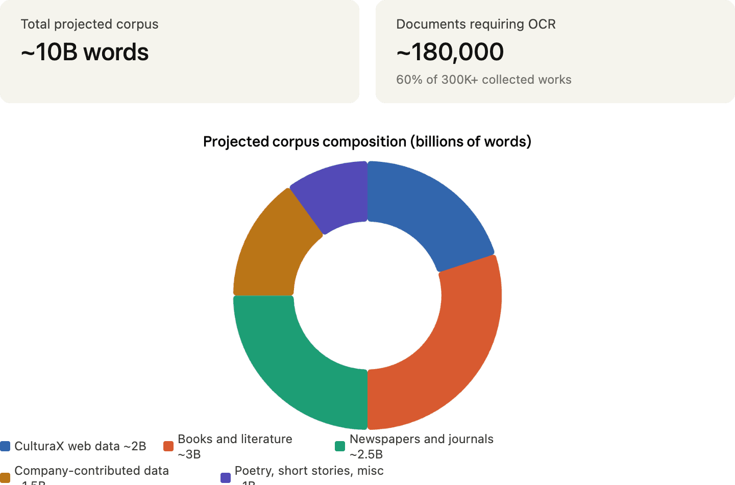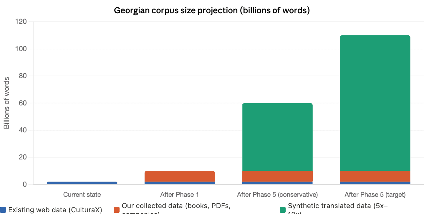 Our projected total corpus size from all these sources is approximately eight billion words. Combined with the roughly two billion words available from CulturaX, this gives us a working corpus of approximately ten billion Georgian words — a five-fold increase over what any existing model has likely been trained on.