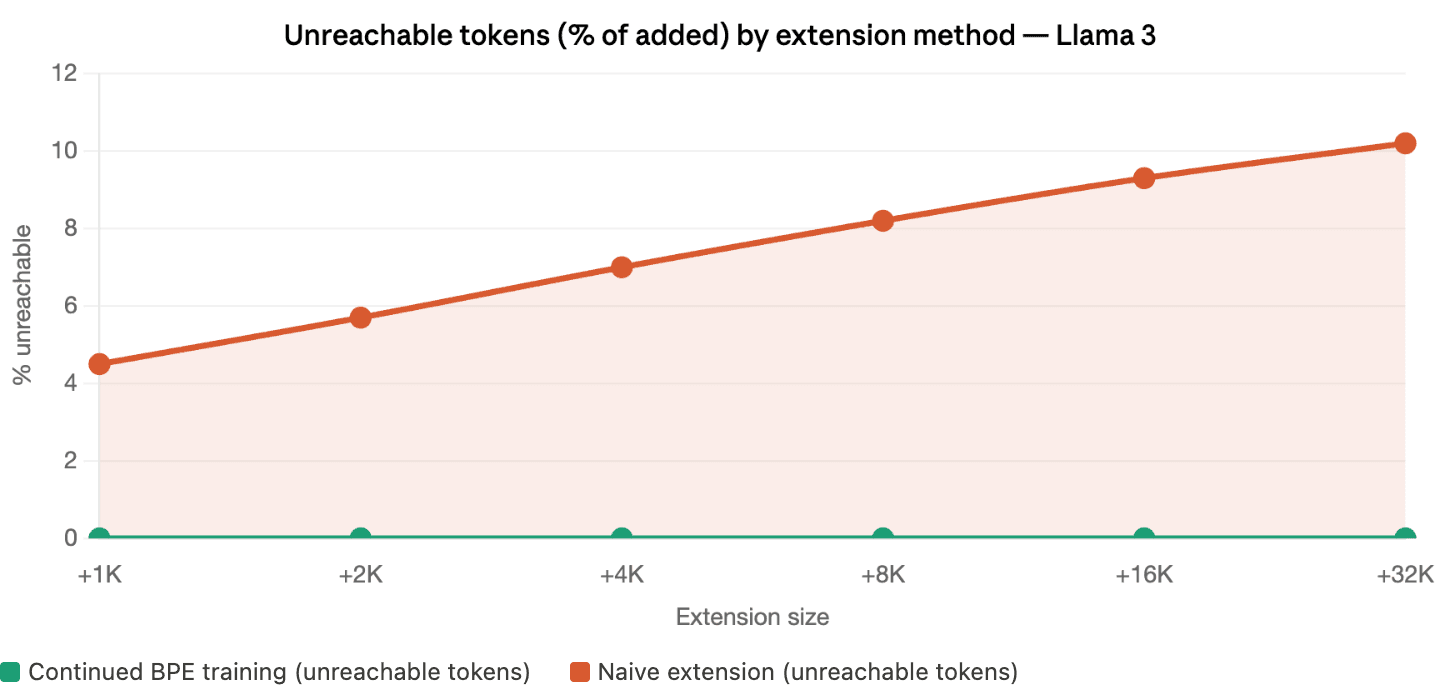 After pruning, we extend the vocabulary with Georgian tokens. The target composition is approximately 40% Georgian tokens in the vocabulary. Rather than training a separate Georgian tokenizer and appending its non-overlapping tokens — the naive approach that has been standard practice — we use continued BPE training. This method resumes the BPE merge learning process directly on Georgian text, starting from the existing tokenizer's merge state. The key advantage is that every new merge operation is guaranteed to be compatible with the existing merge sequence. The naive approach, by contrast, introduces tokens that look useful in isolation but are unreachable through the actual merge operations of the combined tokenizer. Across 70 languages tested, continued BPE training produced zero unreachable tokens, while the naive method left 4% to 10% of added tokens unreachable.