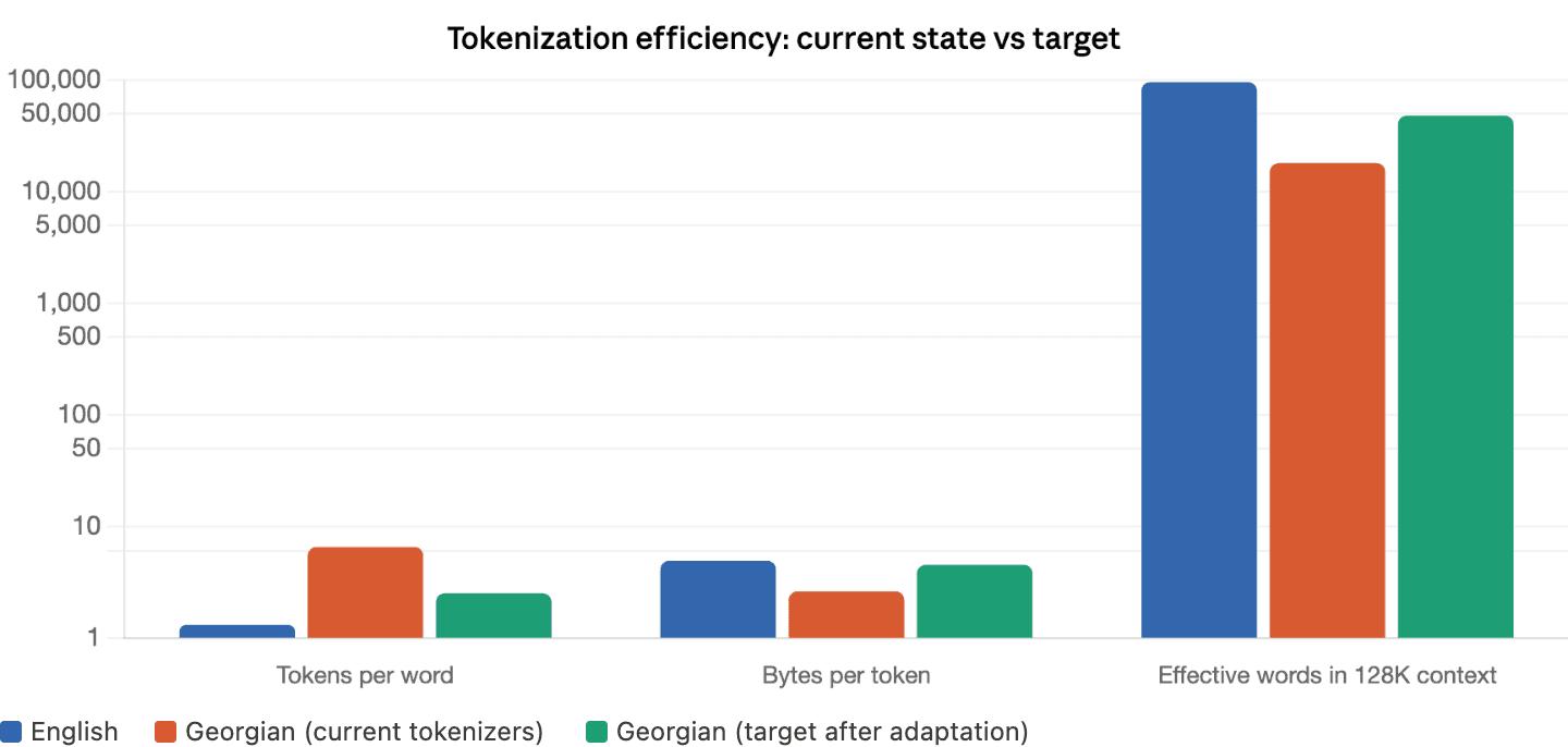 The Georgian language faces a structural disadvantage in the current landscape of large language model development. The three-byte UTF-8 encoding of its script, combined with the near-total absence of Georgian tokens in existing BPE vocabularies, means that Georgian text is tokenized at roughly five to six times the cost of English text — consuming more context, more compute, and more training budget per word of actual content. Compounding this, the total supply of digitally available Georgian text is approximately two billion words, which appears to have already been exhausted by frontier models.