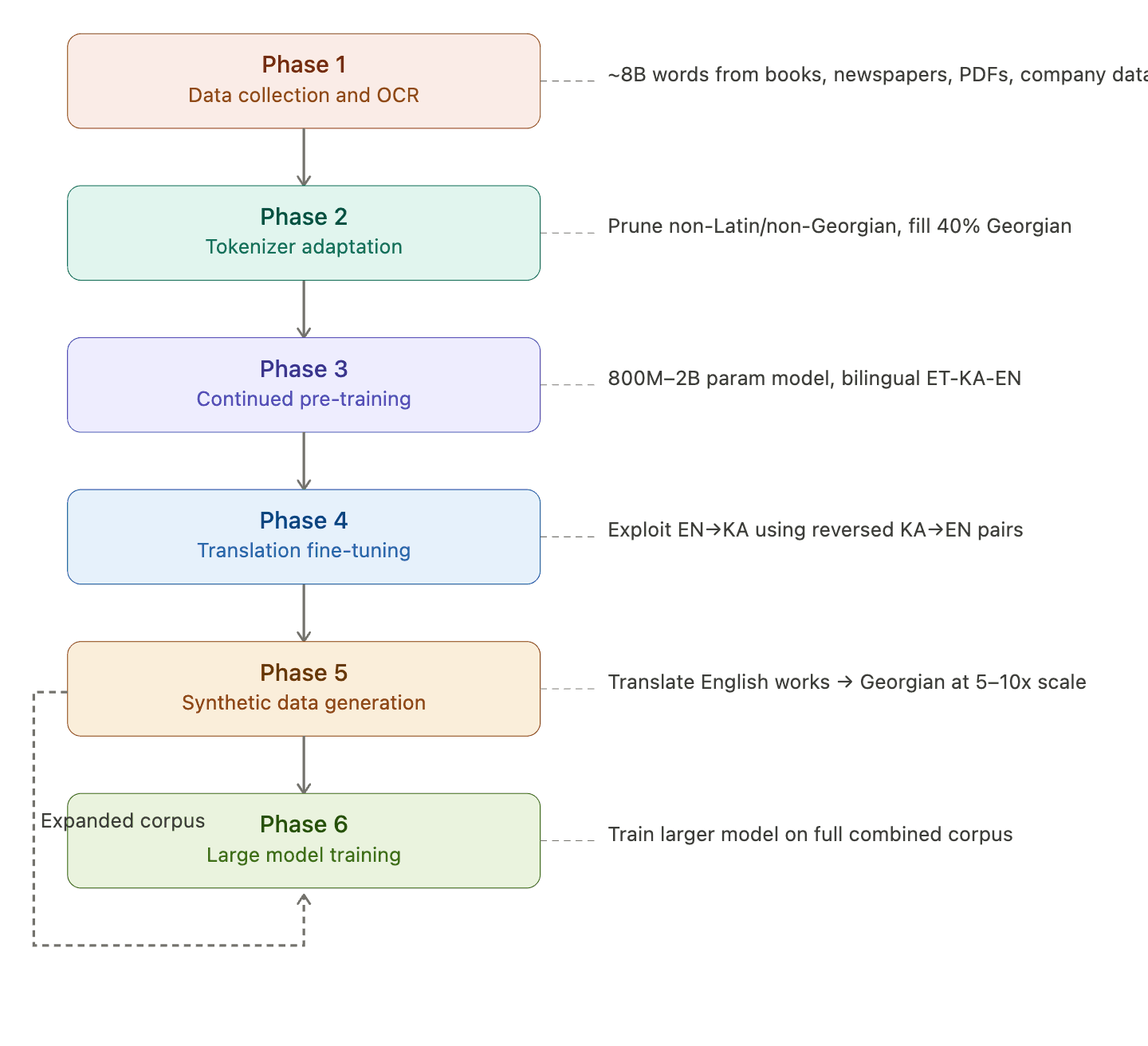 Our plan addresses this through a sequence of interventions that each independently improve the situation and collectively transform it. Tokenizer adaptation through leaf-based pruning and continued BPE training reduces the tokenization cost of Georgian by approximately 69%, bringing it closer to parity with English. A large-scale data acquisition effort targeting offline Georgian texts — books, newspapers, journals, and corporate documents — expands the available corpus by a factor of five. A translation pipeline that exploits the existing strength of LLMs in Georgian-to-English direction, then reverses the parallel data for English-to-Georgian fine-tuning, creates a competent Georgian generator without requiring one to exist first. And constrained synthetic data generation through translation scales the corpus by another order of magnitude without the quality degradation associated with unconstrained generation.